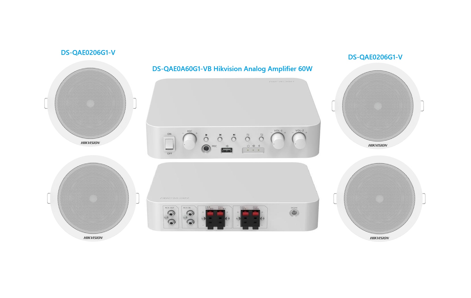 Hikvision ds-qae0ka60206-4 analog audio kit with 60w analog amplifier and 4* 6w ceiling speakers 60w 2-zone analog amplifier:ds-qae0a60g1-vb x1 6w analog ceiling speakers: ds-qae0206g1-v x4 power adaptor for analog amplifier x1 power cord for analog amplifier x1 100v analog audio ceiling system with clear and bright sound quality four types of audio input: microphone, rca, bluetooth, and usb flash drive independent microphone volume control and two-channel output partition volume control perfect for small and medium occasions – ideal for restaurants, bars, and lounges – set the mood with ease