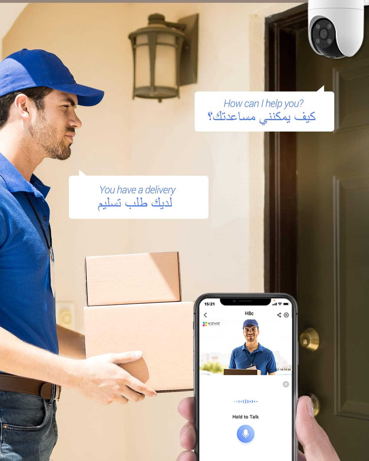 مع كاميرا H8c، يمكنك استخدام هاتفك الذكي ببساطة للاستماع إلى عامل توصيل الطلبات والتحدث إليه أو الترحيب بالضيوف أو مطالبة الغرباء بمغادرة ممتلكاتك – حتى لو لم تكن في المنزل.